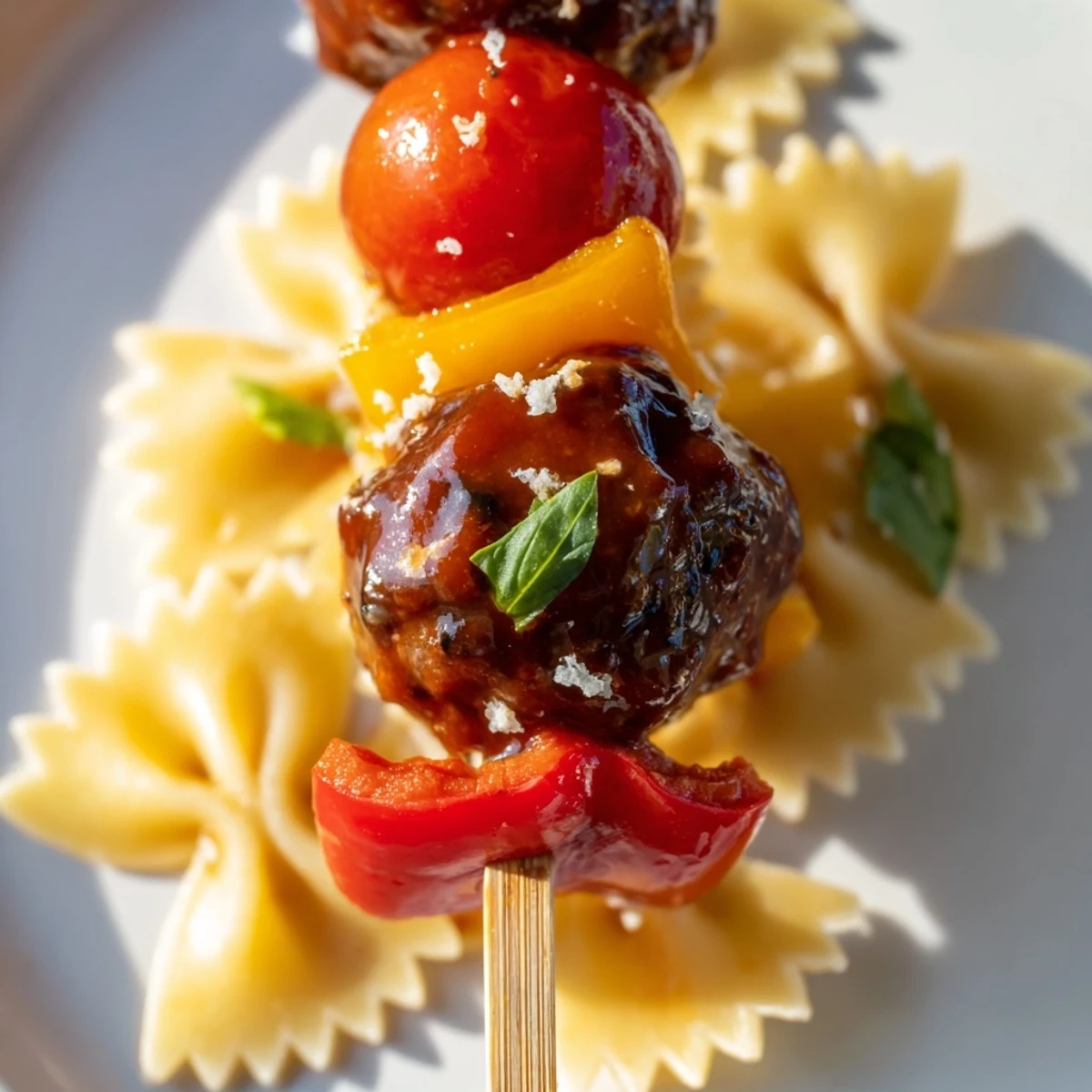 These vibrant party skewers bring together classic Italian-American flavors in a fun, handheld format. Tender farfalle pasta pairs perfectly with juicy cocktail meatballs, while sweet grape tomatoes and crisp bell pepper pieces add freshness and color. A simple glaze of barbecue sauce or marinara with honey ties everything together. Finished with fresh basil and grated Parmesan, each skewer delivers satisfying protein, carbohydrates, and vegetables in one bite.