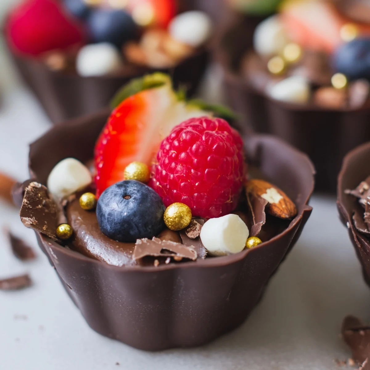 Create stunning chocolate grazing cups with silky dark chocolate mousse and fresh berries. Each cup features a handcrafted chocolate shell filled with airy whipped mousse, then topped with vibrant mixed berries, toasted nuts, and mini marshmallows.