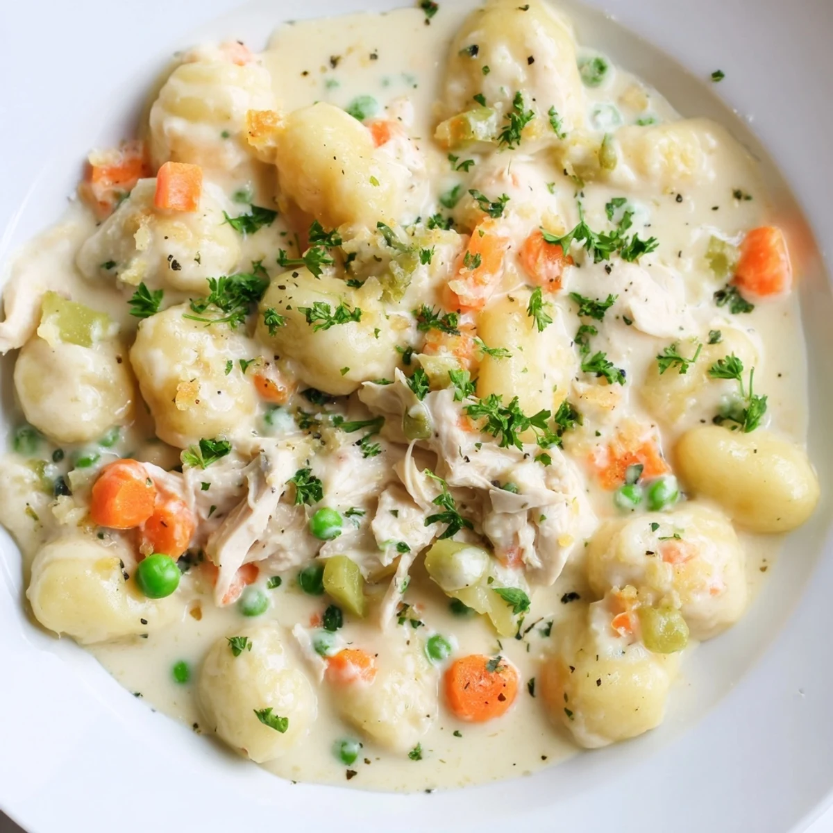 This satisfying one-pot dish brings together tender shredded chicken, soft potato gnocchi, and classic pot pie vegetables swimming in a rich, creamy sauce. The roux-based sauce gets its savory depth from thyme and sage, while the gnocchi absorb all those wonderful flavors as they cook directly in the skillet.