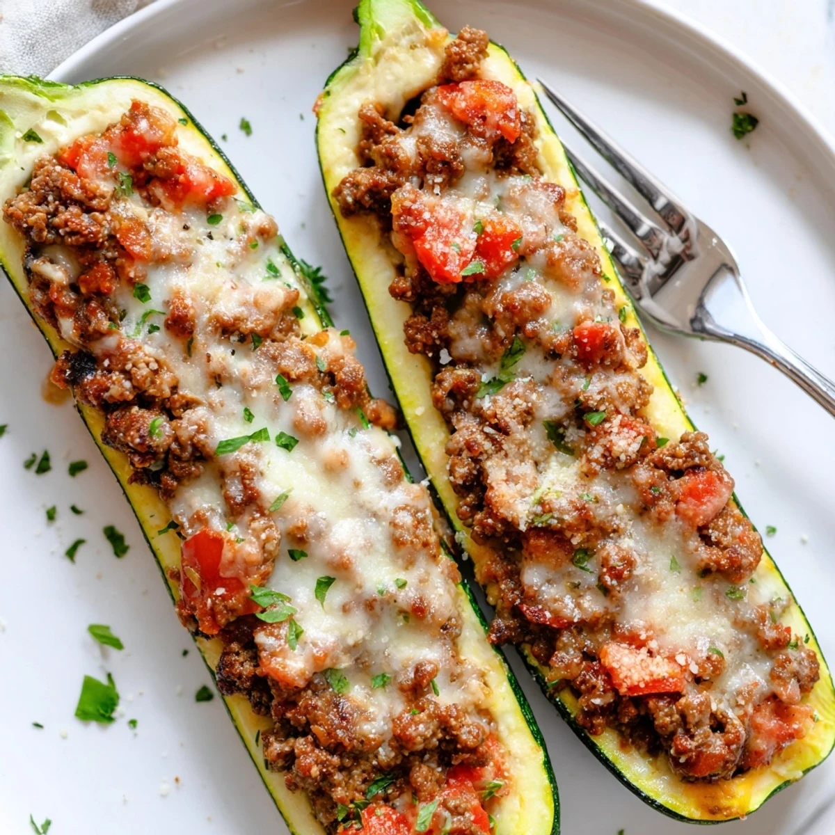 These tender zucchini boats are stuffed with a savory mixture of ground beef, aromatic vegetables, and Italian herbs, then topped with melted mozzarella and Parmesan. The filling combines the scooped zucchini pulp with diced tomatoes, tomato paste, and breadcrumbs for a texture that's both hearty and satisfying. After 35 minutes in the oven, the cheese turns golden and bubbly while the zucchini becomes perfectly tender. This low-carb, gluten-free adaptable dish serves four and makes an excellent weeknight dinner that feels special enough for company.