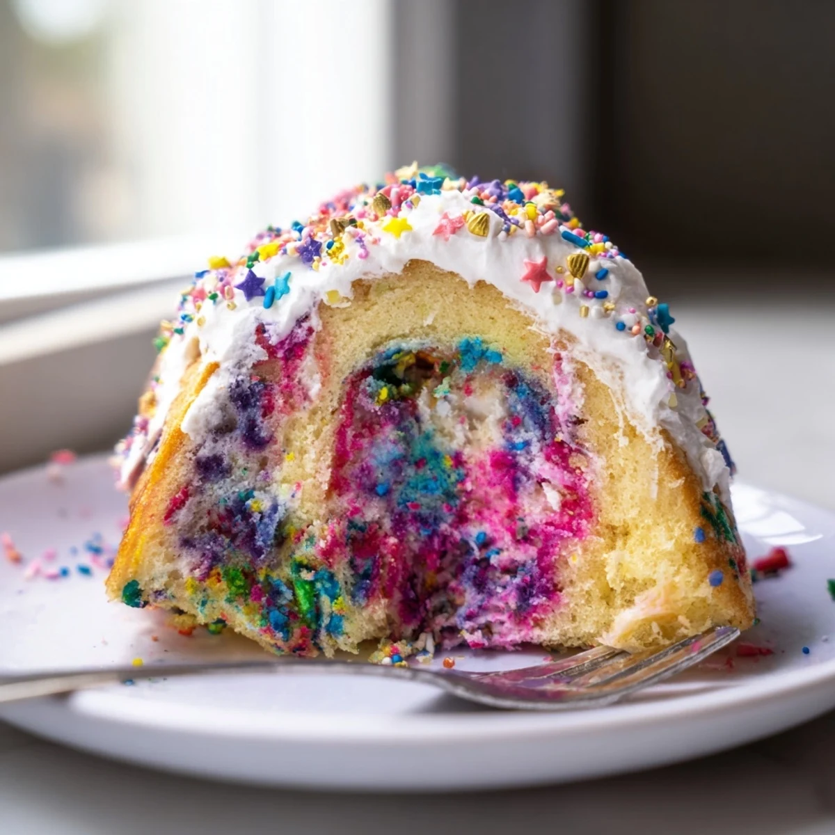 The rainbow pudding filling creates vibrant colors throughout the moist cake layers, while whipped topping and sprinkles add the perfect unicorn-inspired finish that delights both kids and adults.
